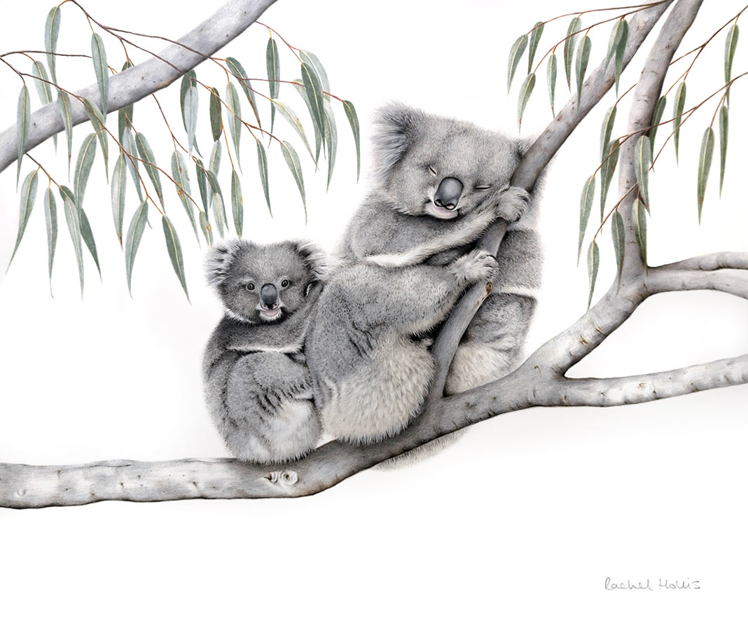 Original drawing of a Koala and her joey taking a rest in a eucalytpus tree.